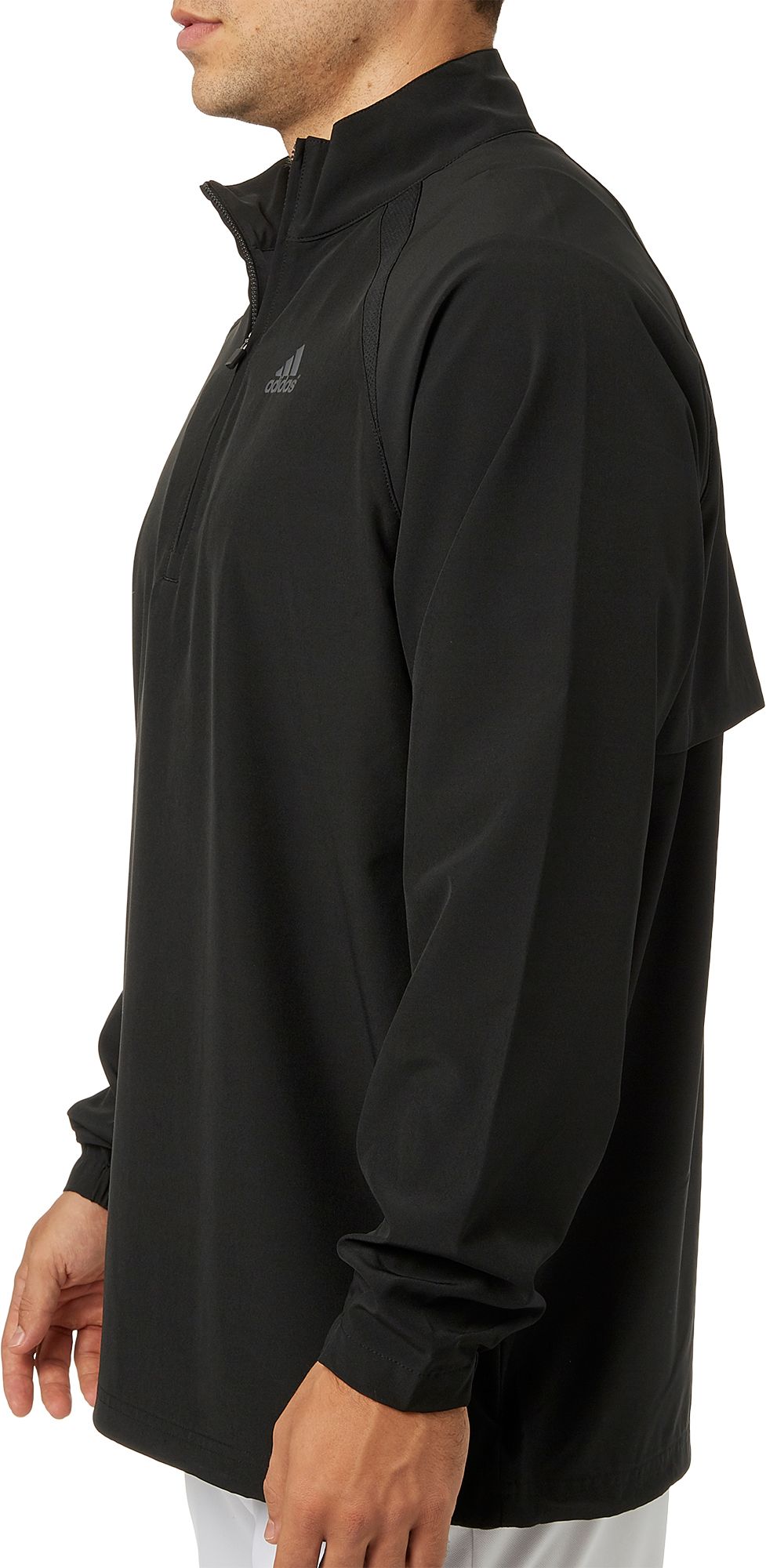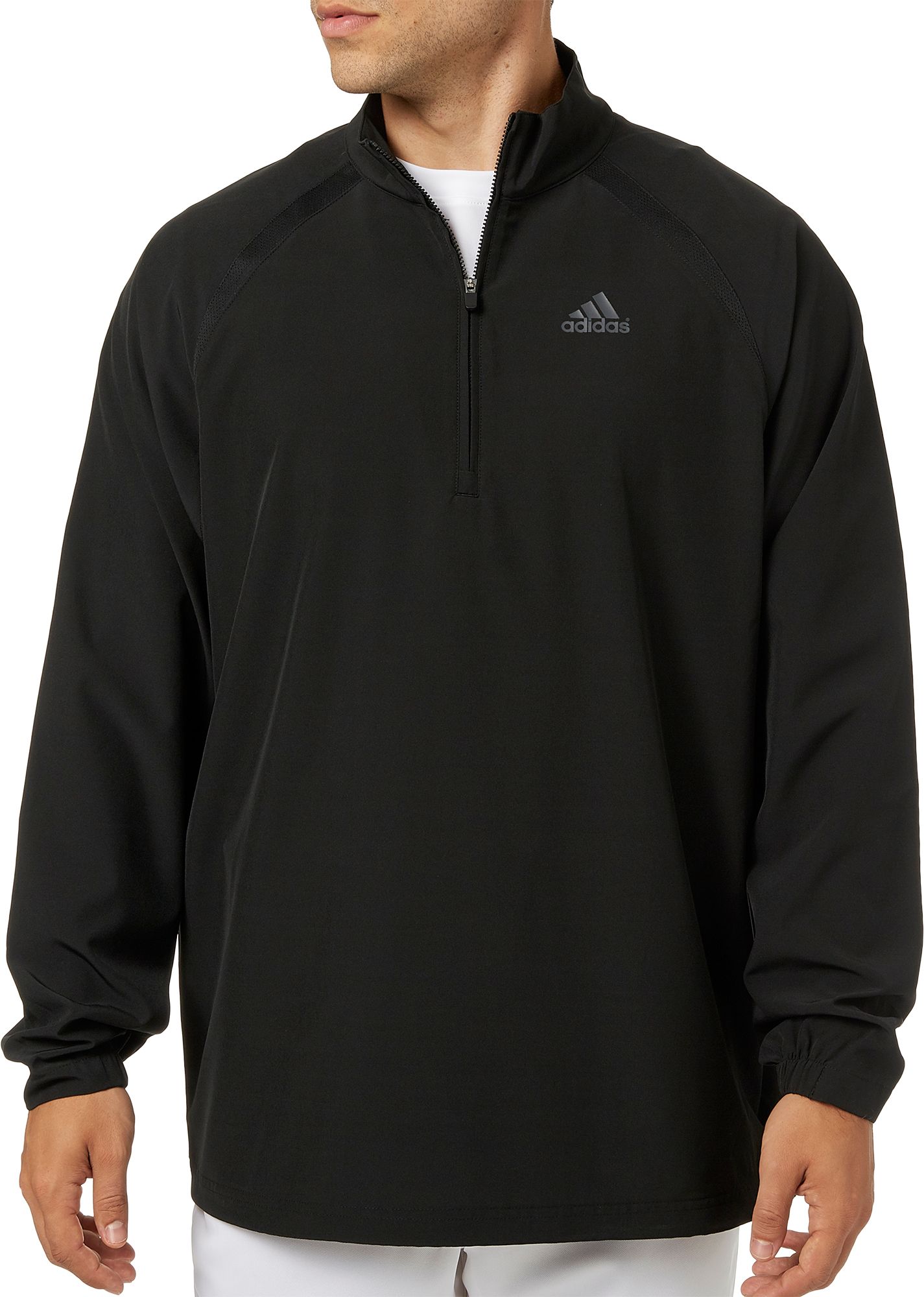 Maintain your focus on the game at hand as you fight off biting winds and rain wearing the adidas Men's Triple Stripe Long Sleeve Baseball Jacket. Resistant to the elements with an athletic, long sleeve design built specifically for baseball players and coaches, this jacket gives players a ventilated, loose fit that is ideal for batting practice and keeping warm during the action.