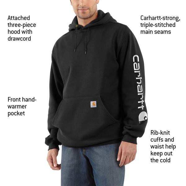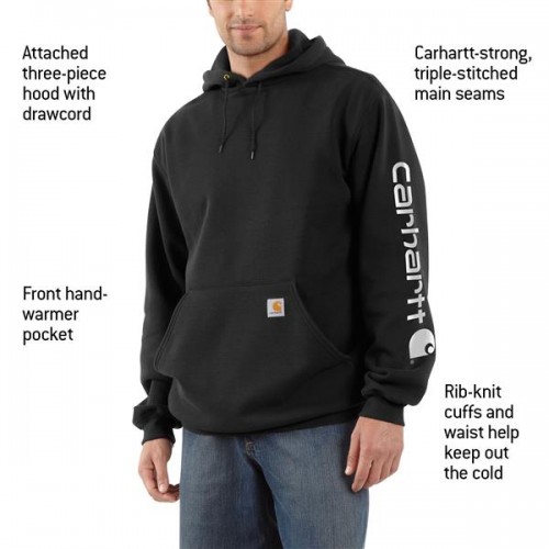 Wear the Carhartt Men's Midweight Sleeve Logo Hoodie while you grill your hard-earned venison. Spandex-reinforced rib-knit cuffs and waistband trap heat and allow freedom of movement. You can adjust the hoodie via the draw cord closure. Warm your hands in the front pocket. Cahartt's logo decorates a patch on the front pocket while "Carhartt" is screen printed on the sleeve. p>